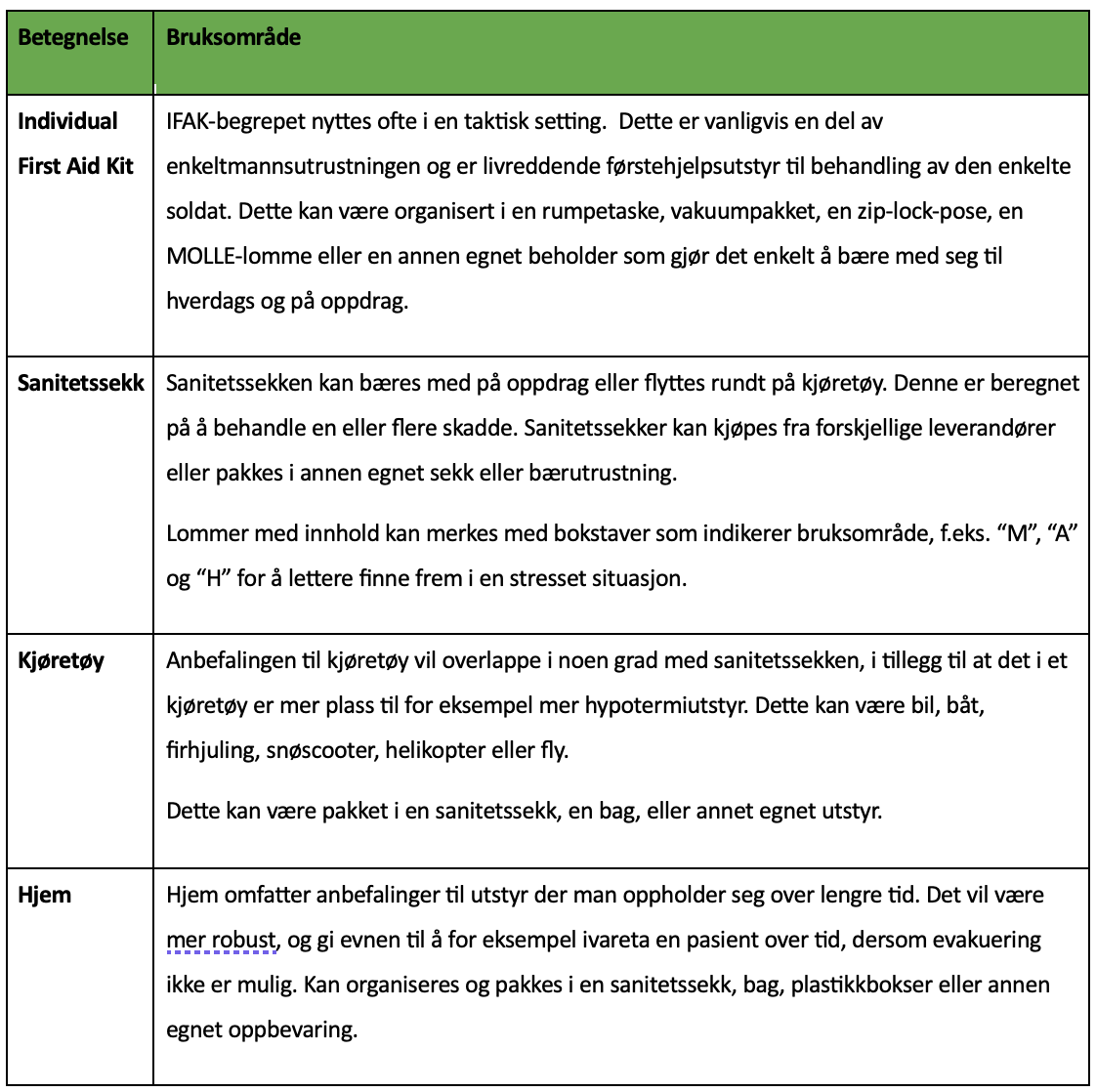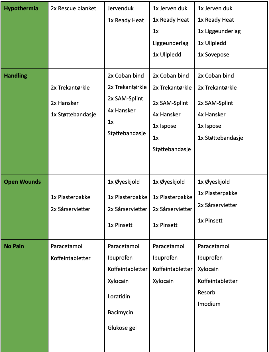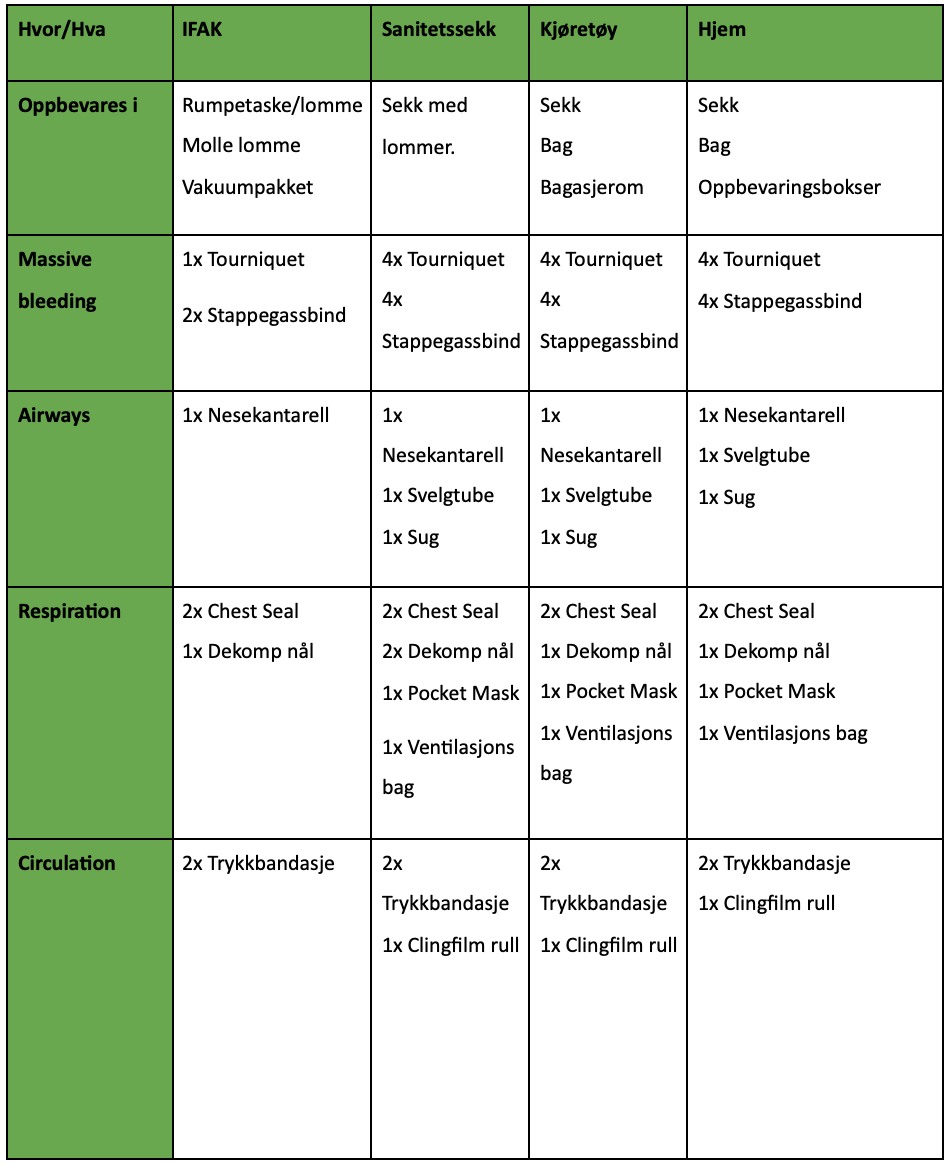 Vi har skrevet våre anbefalinger til førstehjelpsutstyr (sanitetsutstyr) for individuell førstehjelps Kit (IFAK), sanitetssekk, kjøretøy og hjem. Disse anbefalingene er basert på faglige anbefalinger kombinert med erfaring fra militære operasjoner, humanitære oppdrag og arbeid i ambulansetjenesten og akuttmottak. Det er i artikkelen fokusert på medikamenter som kan kjøpes uten resept på apotek, matbutikker og bensinstasjoner. Vi ønsker å vektlegge at ferdigheter og kunnskap er viktigere enn utstyr, og for å ha de beste forutsetningene for å kunne gi livreddende førstehjelp anbefaler vi å øke din kompetanse innen sanitet og førstehjelp.