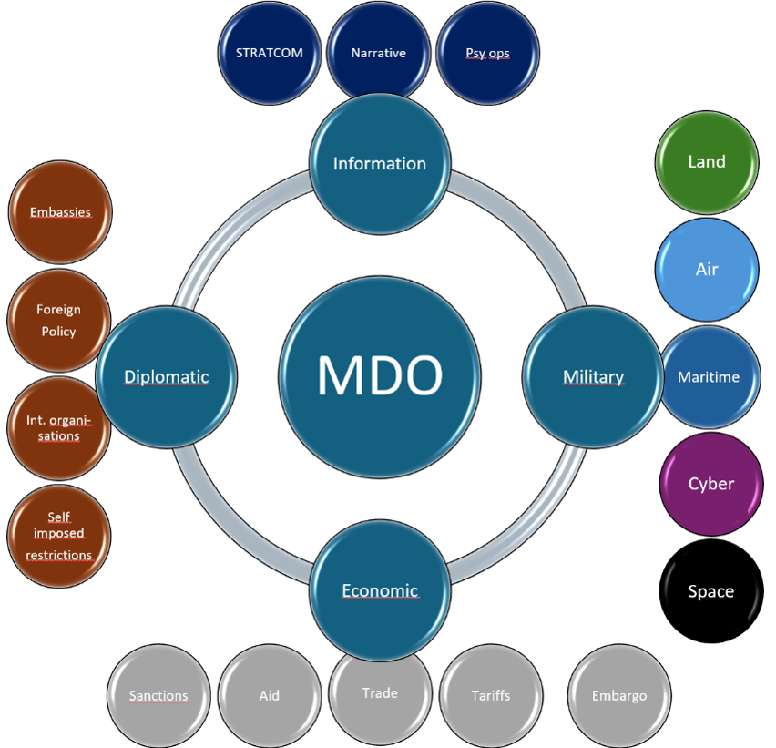 Med NATO definisjonene som grunnlag er MDO hovedsakelig et strategisk anliggende. Dette fritar ikke underlagte kommandonivåer, ned til den løytnanten på troppsjefsnivå å bidra, men stridsteknisk nivå driver ikke med MDO. Dette nivå er M’en i DIME, men synkroniseringen med resten av Instrument of Power ligger noen lønnstrinn høyere opp.