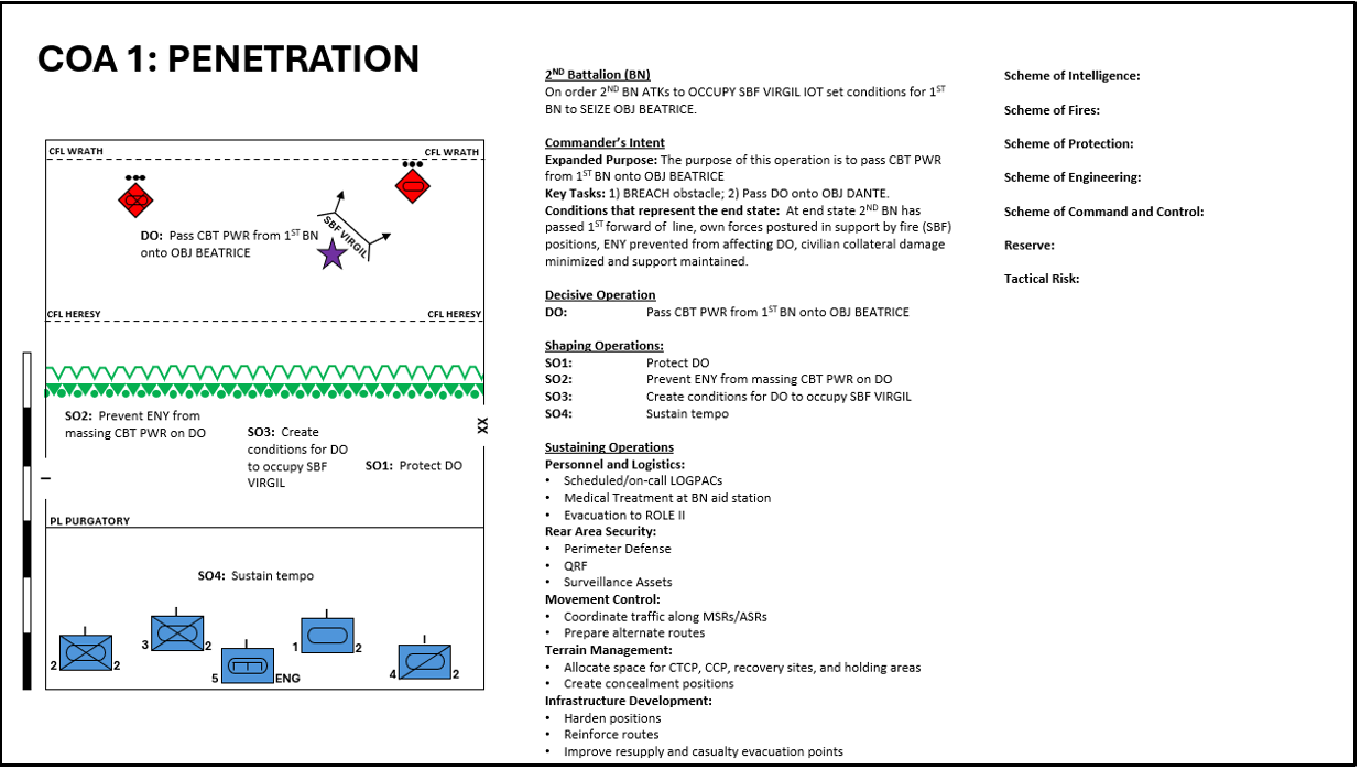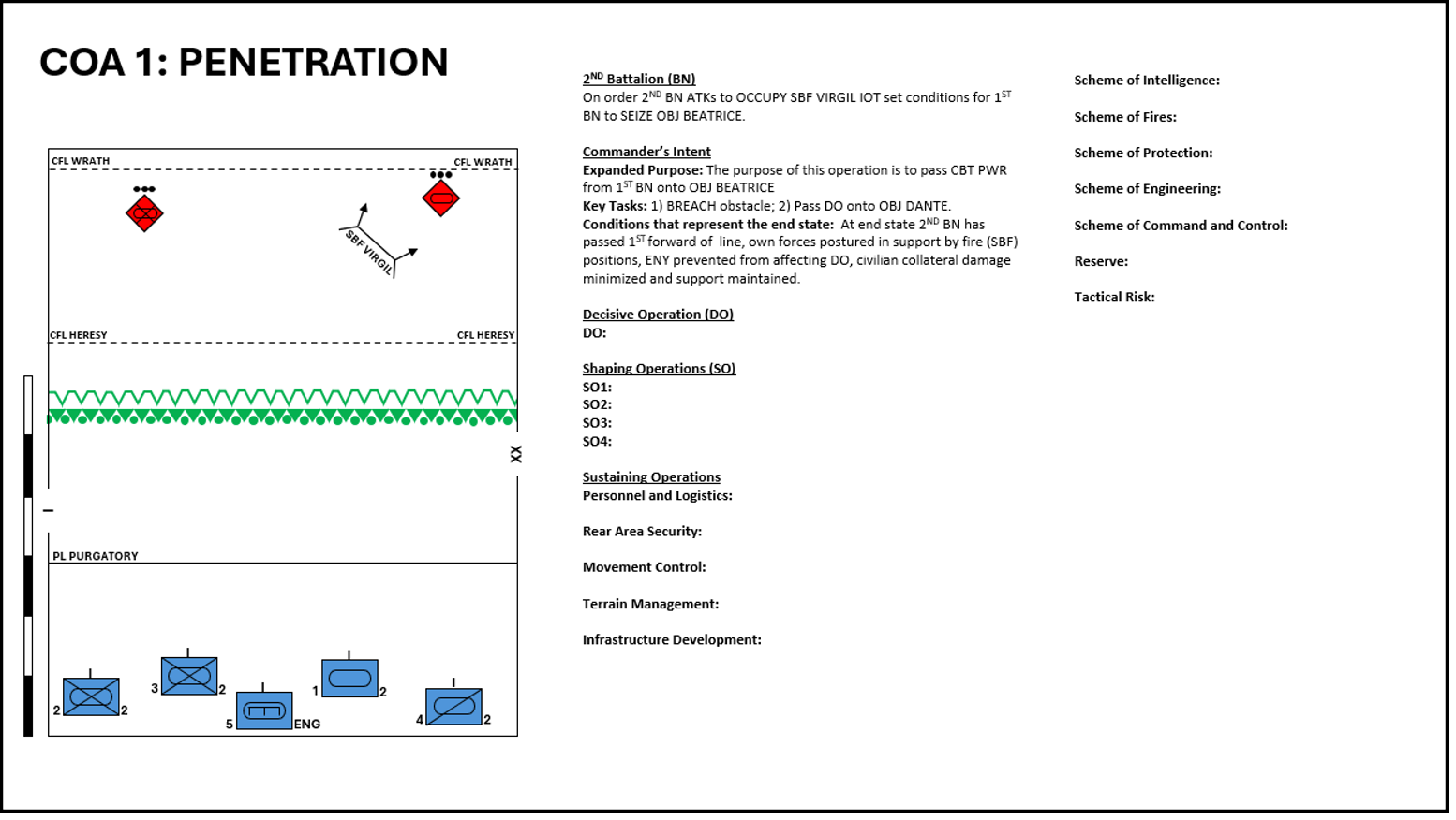 AO kan omfatte flere enheter med felles oppdrag og hensikt. Det er operasjonen, ikke enheten, som er avgjørende. FOer, de som skaper favoriserende forhold for AO gjennom å påføre effekter på fienden eller terrenget, listes med hensikt og integreres horisontalt relativt til AO. Hensikten til de ulike FOene listeføres og passende taktisk oppgavegrafikk tegnes på skissen. Med hensiktene identifisert velger man taktiske oppdragsverb.