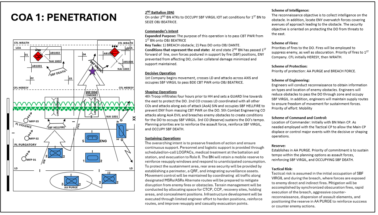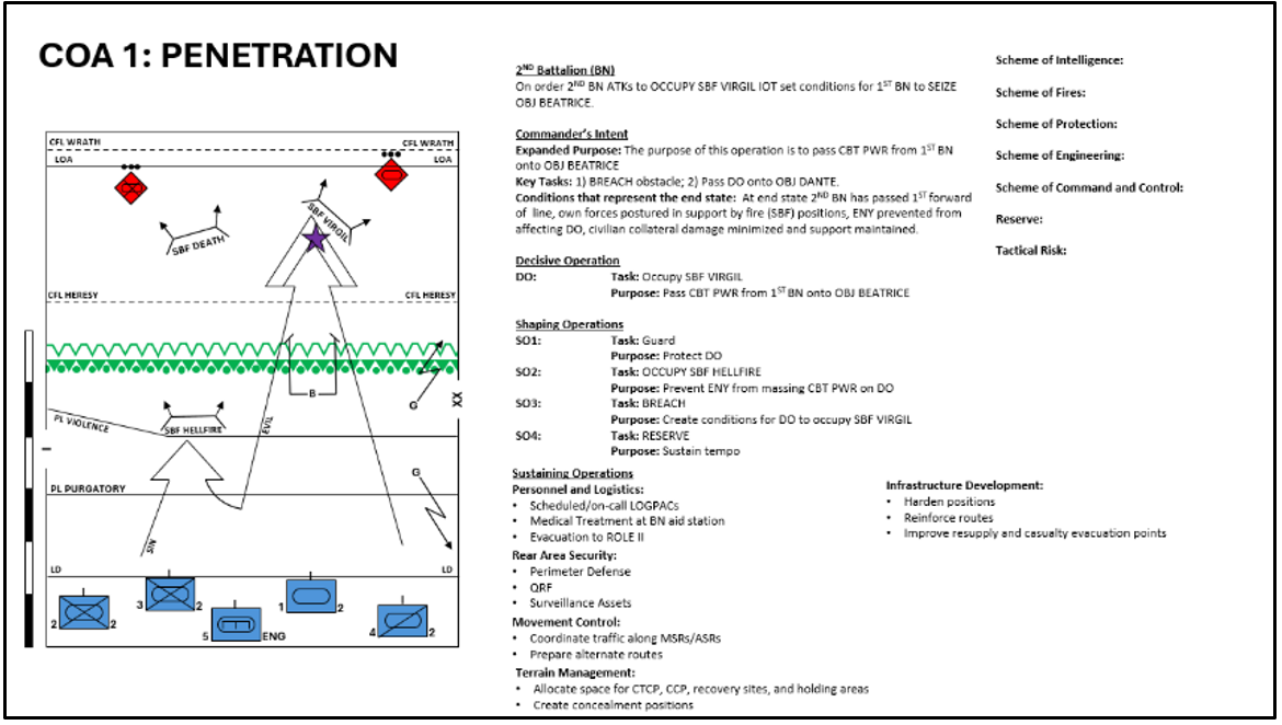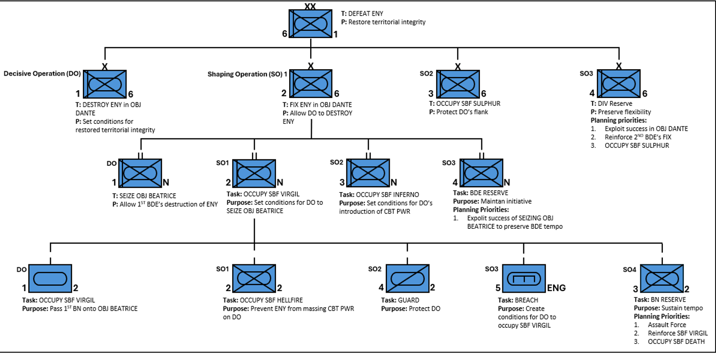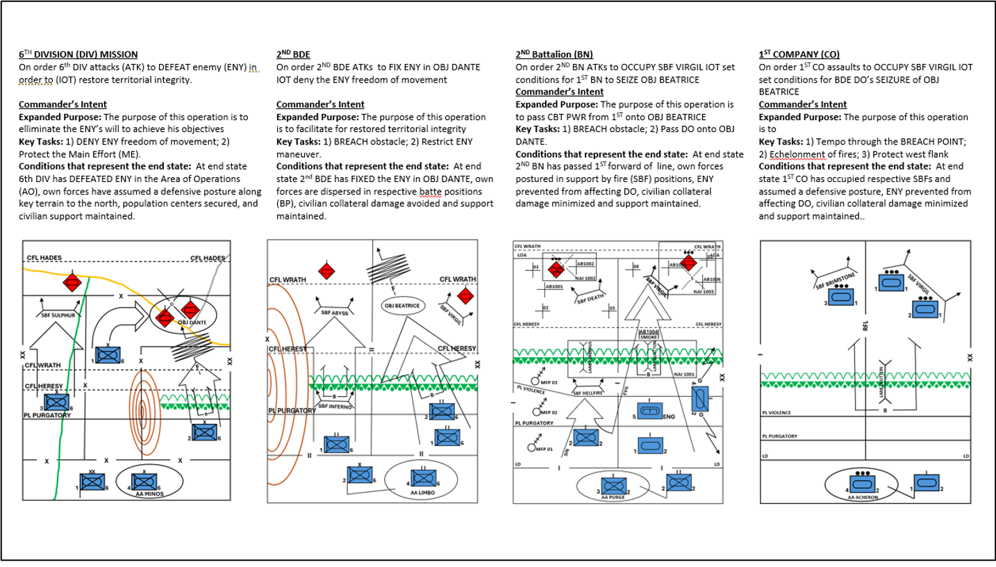 I de to neste illustrasjonene kan man se hvordan ovenstående eksempel sammenfaller med forenklede HM-skisser og tekst fra forskjellige kommandonivå og et integrasjonsdiagram fra divisjons- til troppsnivå.
