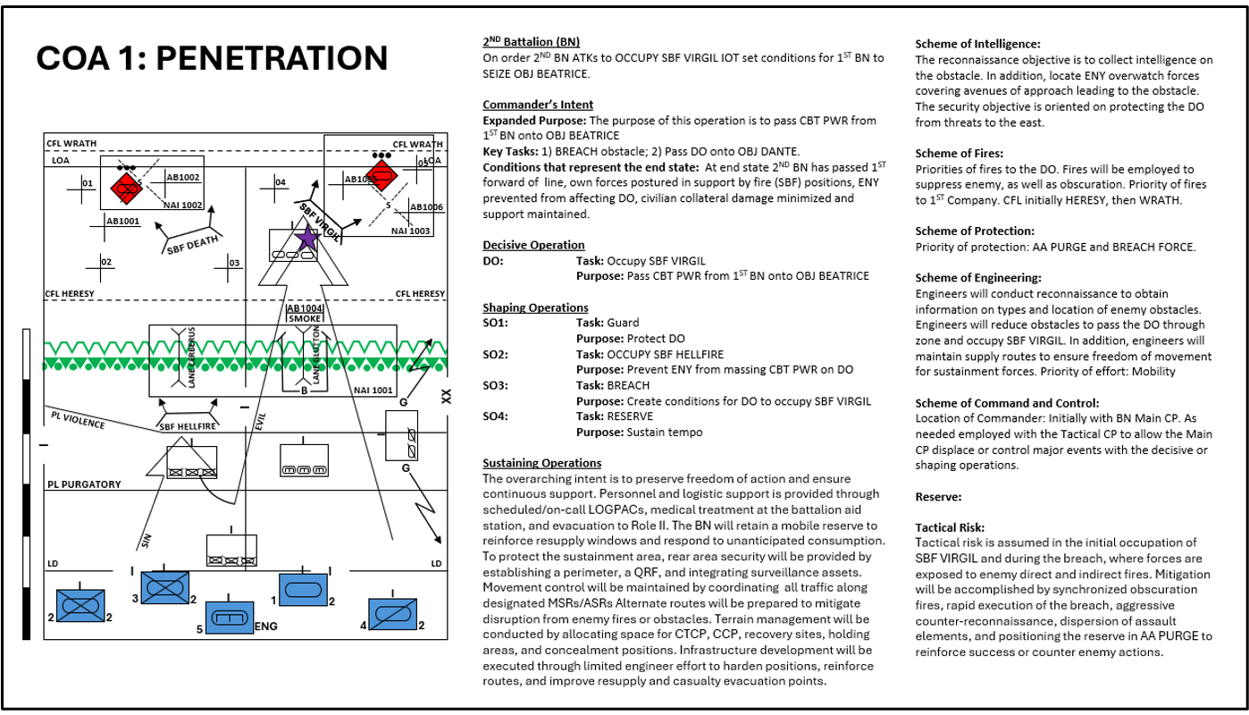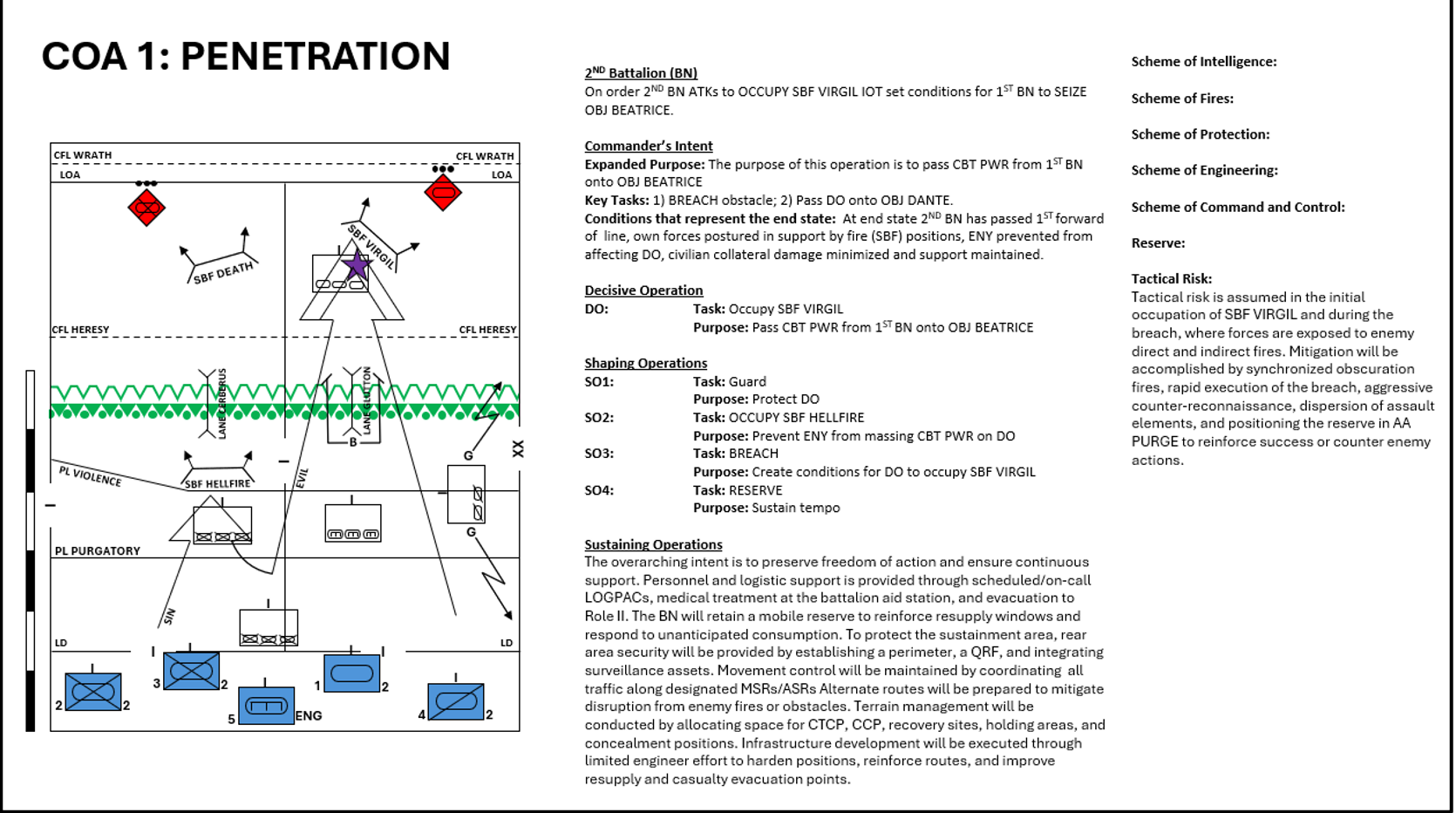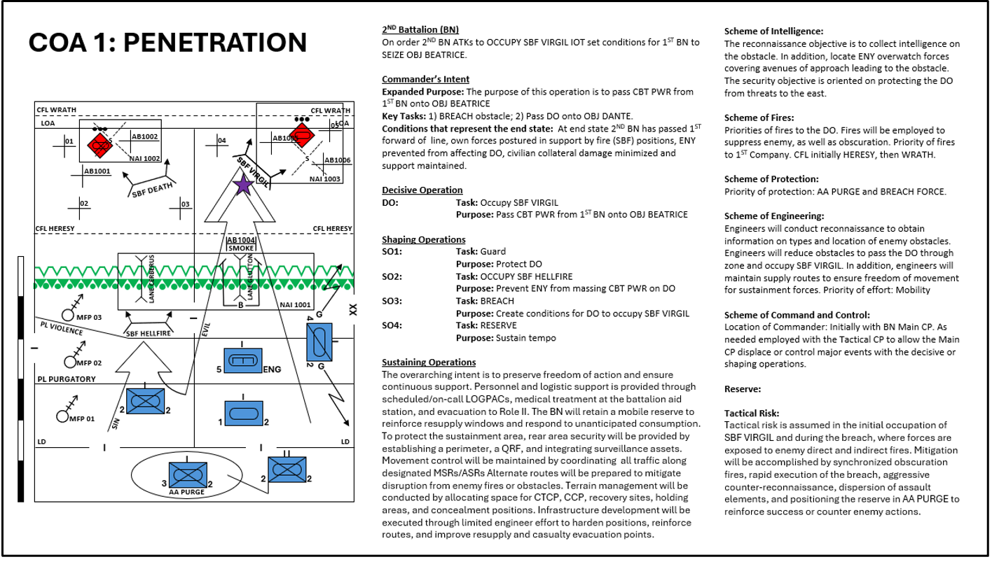 I de to neste illustrasjonene kan man se hvordan ovenstående eksempel sammenfaller med forenklede HM-skisser og tekst fra forskjellige kommandonivå og et integrasjonsdiagram fra divisjons- til troppsnivå.