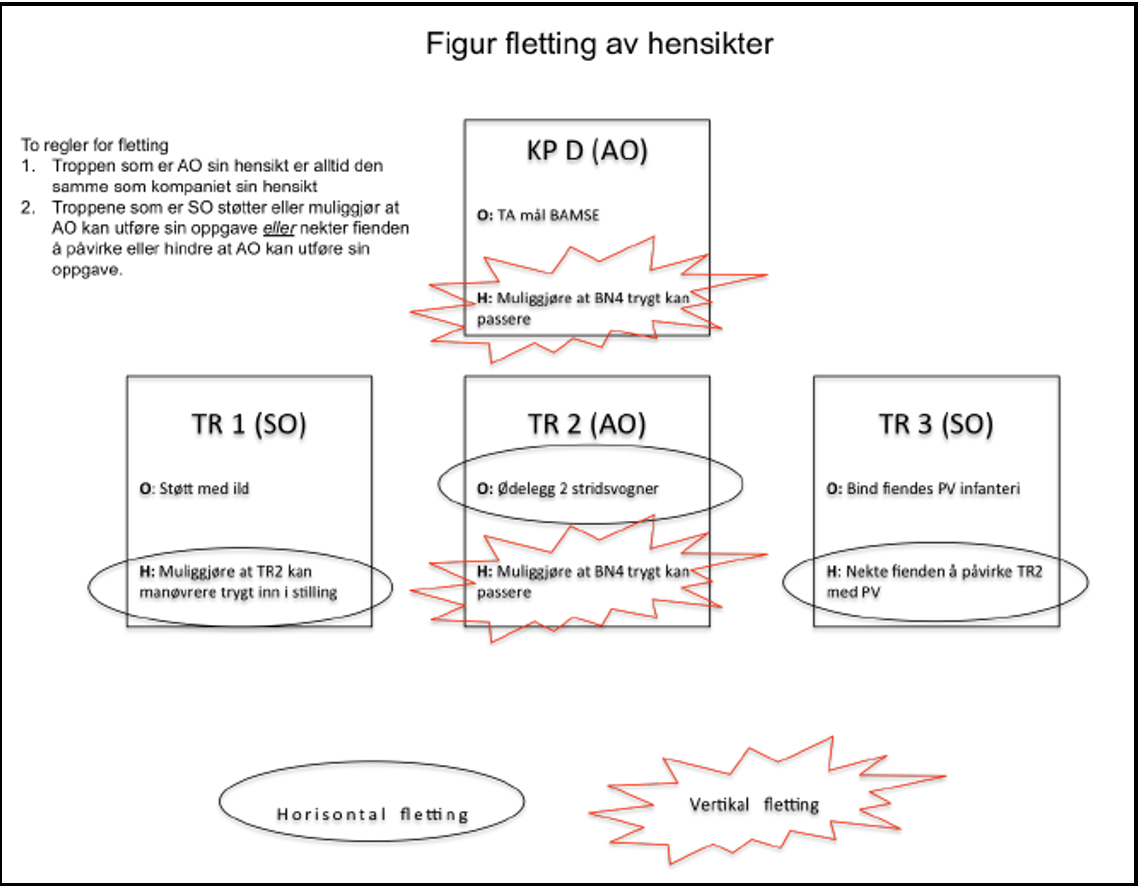 Prinsippet om vertikal integrasjon tilsvarer den amerikanske teknikken nested concepts. For å sikre sammenheng tar man utgangspunkt i operasjonens hovedinnsats, essensielle oppgave, eller avgjørende operasjon. David Seppola omtalte dette som fletting av hensikter[11] der han beskrev og illustrerte hvordan integrasjon kan oppnås horisontalt og vertikalt i en artikkel som søkte å forbedre Hærens PBP slik at en operasjonsordre ble bedre tilpasset oppdragsbasert ledelse.