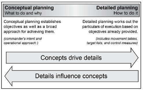 Denne uklarheten står i kontrast til den amerikanske hæren som tydelig skiller mellom konseptuell og detaljert planlegging. Army Design Methodology (ADM) viser hvordan konseptuell planlegging driver detaljerte planlegging. Tilnærmingen er distinkt, valgfri og ment for problemer som er uklare slik at staben kan avdekke dets natur. Brigade- og bataljonsnivå har sjelden ressurser til å bruke ADM. Metoden er derfor hovedsakelig tiltenkt operasjonelt og strategisk nivå.