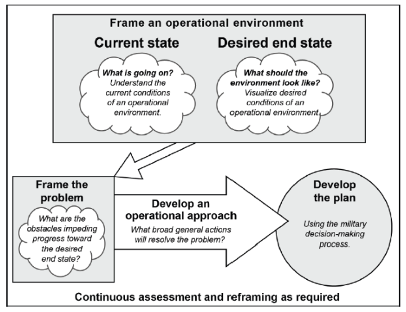 Stabshåndboka forsøker å forene tilnærmingene[3]. Resultatet blir metodisk tvetydighet. Prosessen er obligatorisk og beskrives både som et selvstendig trinn og en integrert del av planprosessen. Stabshåndboka anvender operasjonsdesign slik COPD og AJP-5 gjør det. Dermed brukes verktøyene til å beskrive allerede kjente forhold. Hensikten forskyves fra innsikt til et krav om produkt. Metoden blir et byråkratisk ritual og favner verken konseptuell refleksjon eller detaljert planlegging.