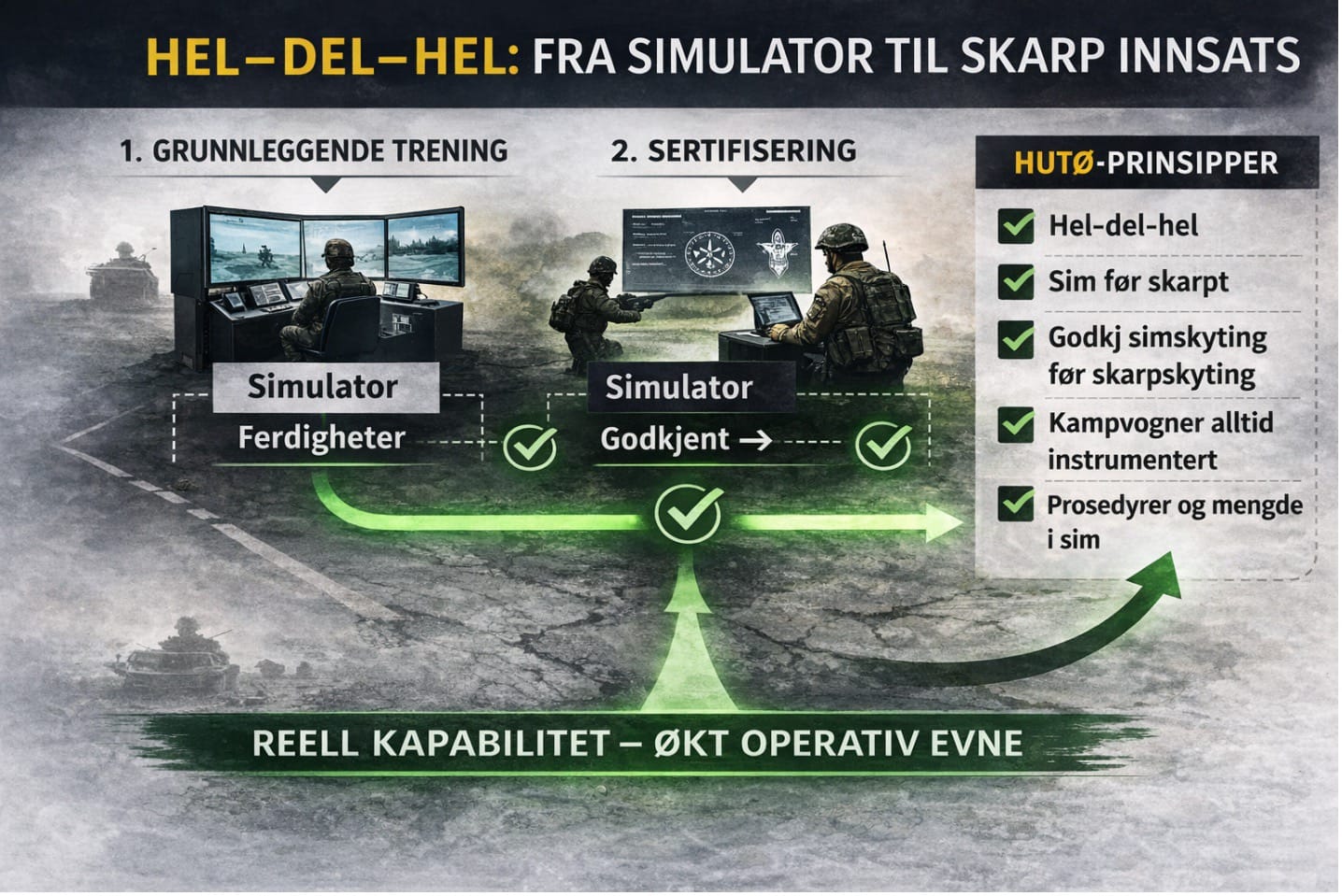 Simulatorbruk i treningsprogresjonen bør forstås på samme måte. Det handler ikke om detaljstyring av avdelingers trening, men om å etablere felles standarder som sikrer at soldater og avdelinger utvikler nødvendige ferdigheter på en systematisk og effektiv måte.