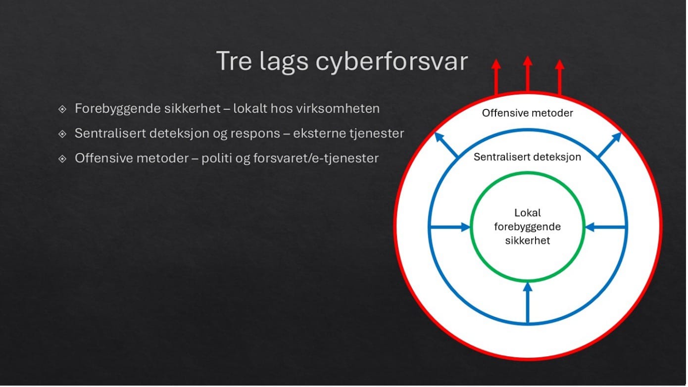 Når vi snakker om, eller øver, vår nasjonale evne til beskyttelse i cyberdomenet, må vi omhandle alle de tre lagene av cyberforsvar. Som jeg har vært innom tidligere, er det svært ofte at hvert enkelt virkemiddel diskuteres isolert og hver for seg. Spesielt i forbindelse med innføringen av nye virkemidler og lovverk. Men dersom vi som samfunn ønsker å oppnå en best mulig beskyttelse mot fremmede aktørers cyberoperasjoner, enten disse utføres av kriminelle eller aktører tilknyttet fremmede stater, er vi nødt til å betrakte og vurdere de ulike virkemidlene, deres styrker og svakheter – i samspill.