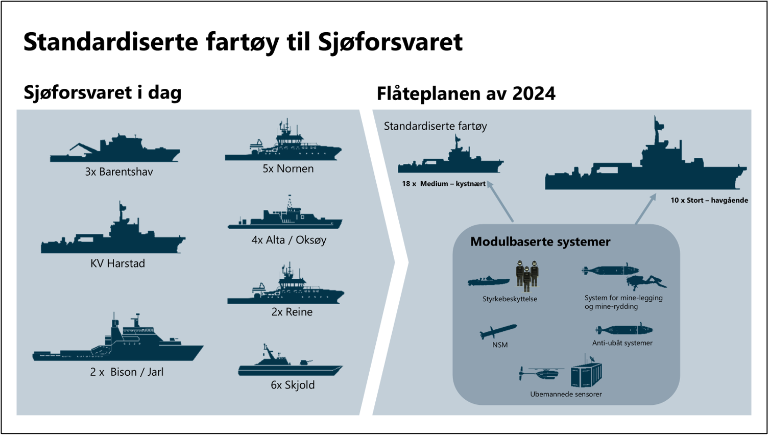 Dette bakteppet krever at Sjøforsvarets flåte har økt volum, utholdenhet og tilstedeværelse i norske havområder, samt evnen til å avskrekke og forsvare våre grunnleggende verdier og interesser.