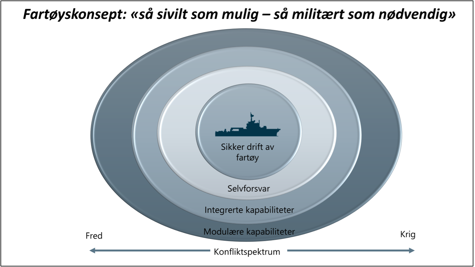 Sjef Sjøforsvaret, Oliver Berdal, har omtalt fartøyene som «store, seilende verktøykasser» (Olsen, 2024), var det nettopp dette han mente: en plattform som ikke er låst til én oppgave, men som kan konfigureres, forsterkes og fornyes. Dette skal resultere i strategisk valuta i form av tilgjengelighet, fleksibilitet og fremtidig bærekraft.